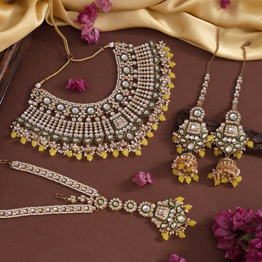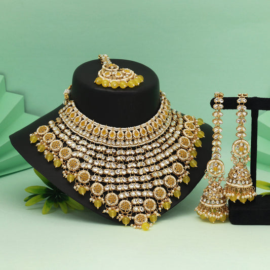 Yellow Color Kundan Necklace Set Designed For Traditional Wedding Wear