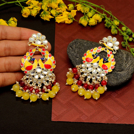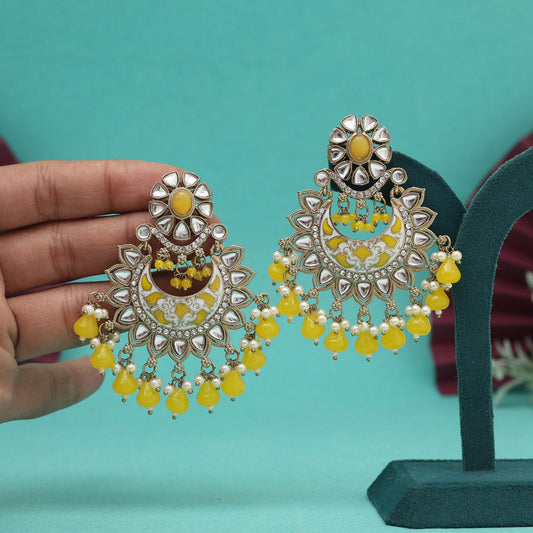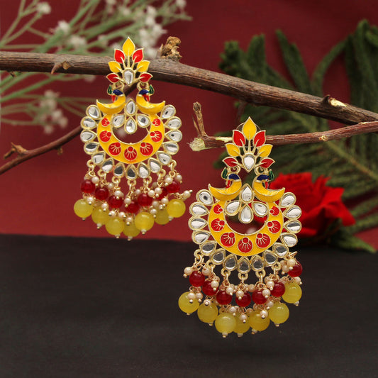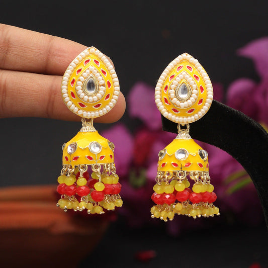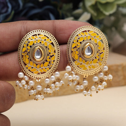 Yellow Color Meena Work Kundan Earrings (KDE984YLW)