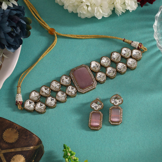 Pink Color Handmade Jaipur Choker Necklace With Moissanite And Monalisa Stones (CZN1067PNK)