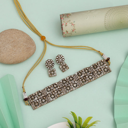 White Color Choker American Diamond Necklace Set With Modern Ethnic Appeal