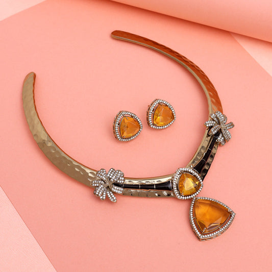 Gold Color Unique Handmade Brass Metal With Monalisa Stones & American Diamond Apala Polish Hasli Necklace Of Jaipur (CZN1059GLD)