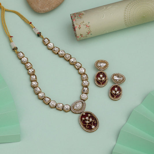 Maroon & Green Color Premium Handmade Brass Necklace With Moissanite Stones (CZN1069MG)