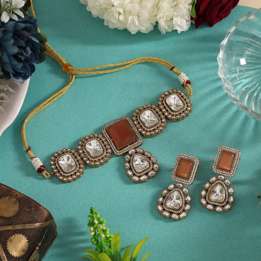 Light Brown Color Premium Jaipur American Diamond Jewellery Brass Choker Necklace With Beautiful Monalisa And Moissanite Stone (CZN1064LBRW)