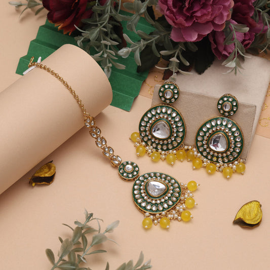 Yellow Color Meena Work Kundan Necklace Set For Traditional Festive Vibe