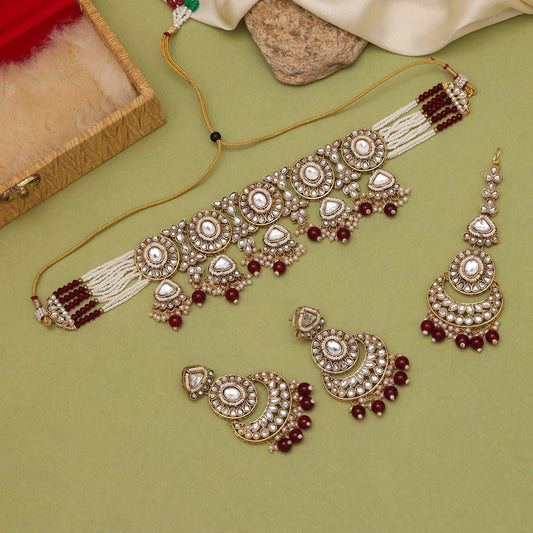 Antique Style Maroon Color Choker Kundan Necklace Set For Traditional Outfits
