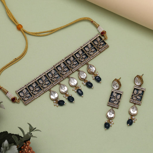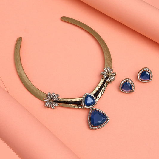 Blue Color Unique Brass Choker Necklace With Ad And Moissanite Stone (CZN1065BLU)