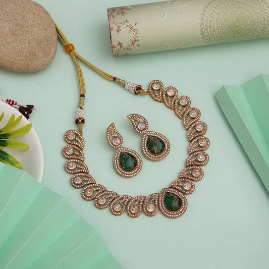 Bright Green Color American Diamond Necklace Set For Daily Festive Outfit Pairing